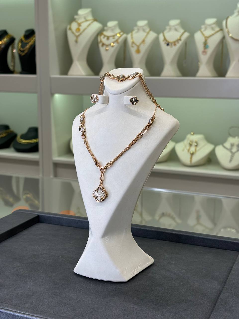 دستبند: 6.96 گرم, گردنبند: 10.84 گرم, گوشواره: 1.45 گرم  |